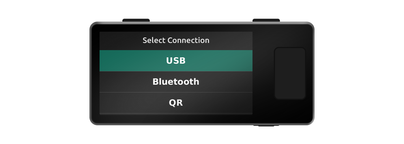 - USB、Bluetooth、QRのいずれかを選択し、Blockstream Jadeを互換性のあるコンパニオンアプリに接続します。ウォレットに一時的にログインでき、Jadeの電源がオフになるまでリカバリーフレーズを使用できます。